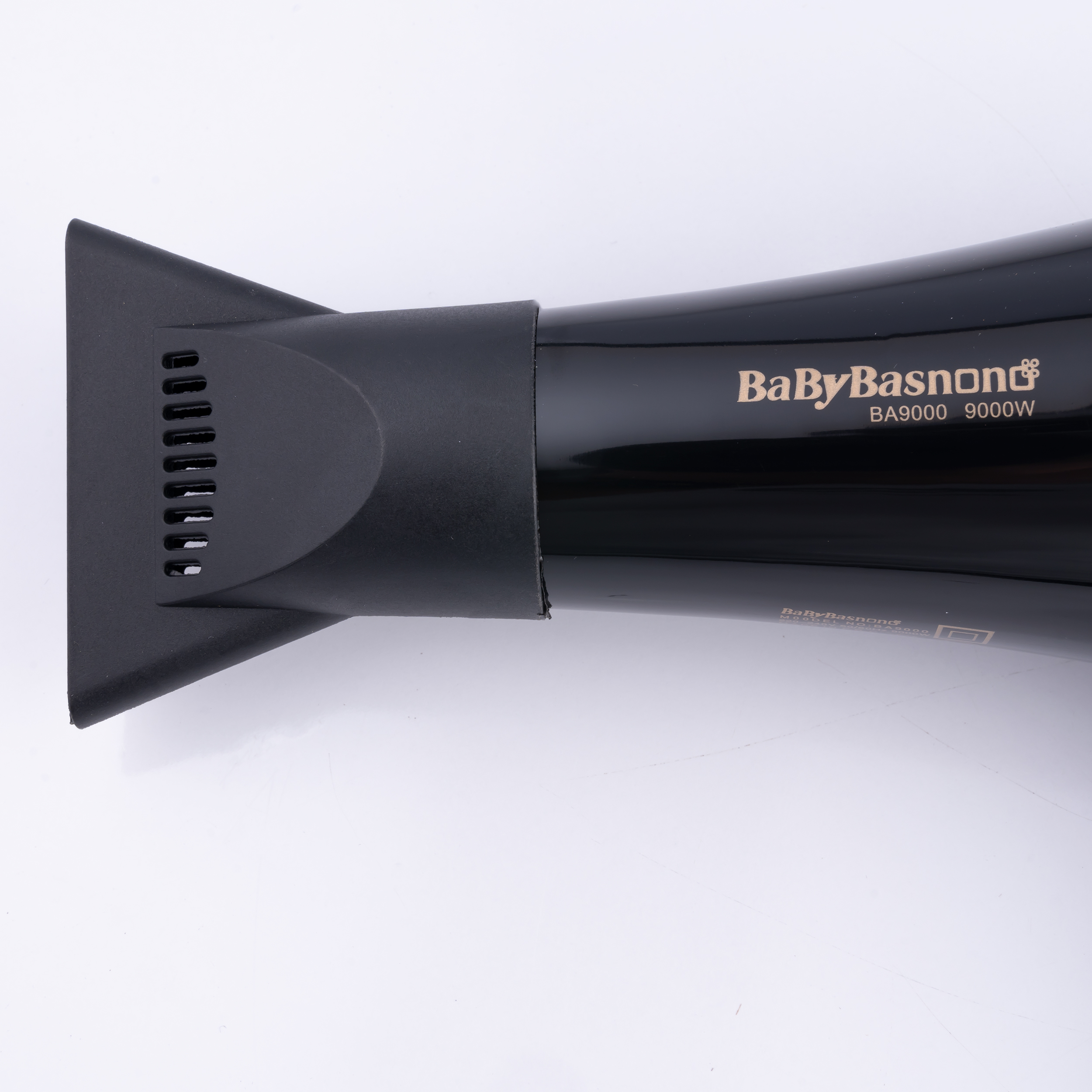 سشوار بیبی باس نانو مدل BA9000 دارای موتور AC با توان 9000 وات است. المنت به کار رفته در این سشوار از جنس پیشرفته بوده و باعث میشود تا موها ظاهر ابریشمی و لطیف پس از خشک کردن داشته باشند. موتور سشوار بیبی باس نانو AC بوده و در کنار قدرت فوق العادهای که دارد صدای زیادی را نیز تولید نمیکند و به وسیله آن میتوانید موهای خود را خیلی سریع خشک و حالت دهی کنید. شما میتوانید سرعت باد سشوار را در دو حالت و حرارت آن را هم در دو حالت متفاوت تنظیم کنید. با فعال کردن باد سرد المنت به صورت لحظهای از کار میافتد تا شما بتوانید به کمک آن حالت بخشی از مو را تثبیت کنید. همراه این سشوار 2 عدد متمرکز کننده برای ایجاد فشار بیشتر ارائه شده است. گفتنی است فیلتر هوای سشوار را میتوان از آن جدا و تمیز کنید. همچنین این سشوار دارای چراغ روشنگر LED بوده و مجهز به سیستم تولید یون نیز است که باعث میشود مو با سرعت بیشتری خشک شود و در نتیجه آسیب کمتری به مو وارد میشود. به دلیل بلند بودن کابل این سشوار که در حدود 2.1 متر است، برای استفاده در سالنهای آرایشی بسیار مناسب بوده و روی دسته آن نیز حلقهای جهت آویزان کردن آن وجود دارد.